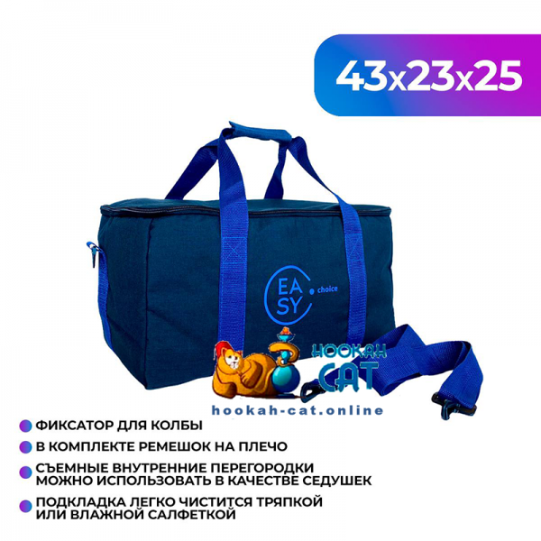 Сумка для кальяна Easy Choice Черная Синяя - стильная, удобная и очень вместительная сумка. Внутри сумки очень много кармашков, чтобы вы могли комфортно разложить аксессуары для кальяна. А отдел для колбы идет со специальным фиксатором для горлышка. Ее легко почистить обычной тряпочкой или влажной салфеткой.