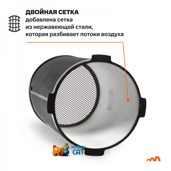 Сетка Duet имеет двойную защиту - к стандартной версии ребята добавили еще одну сетку, которая разбивает потоки воздуха. При этом внутрення сетка не перегревает чашу - воздух спокойно циркулирует, курение комфортное.