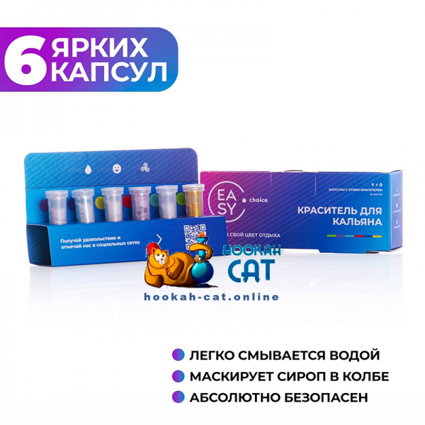 Краситель для колбы Easy Choice (набор) - набор из шести шиммеров разного цвета. Одна капсула рассчитана на один кальян. Зачем они нужны? - во первых это красиво, во вторых цвет можно подобрать под вкус в чашке и он будет усиливать восприятие вкуса, здорово же!