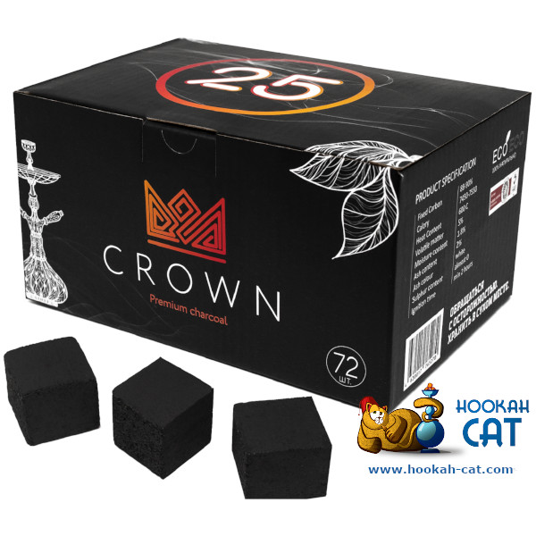 Уголь для кальяна Crown (Краун) 72 шт. (25мм, 1кг) - производится из скорлупы кокосового ореха. Данный уголь имеет квадратную форму (не flat). Не обладает посторонним запахом при розжиге. Долгий ровный жар, мало пепла, вкус табака не меняется, жар держится около 1 часа! Уголь больше чем стандартный, за счет этого горит дольше и греет чашку лучше. Но при этом в калауд влезает только 2 угля