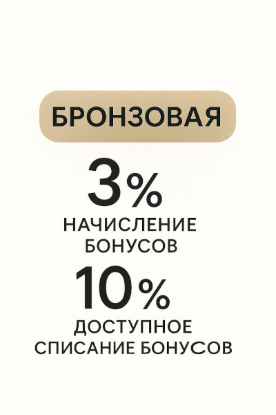 - Бронзовый - выдается при регистрации, карта дает кешбек бонусными рублями 3% от суммы всей покупки, баллами можно оплатить до 10% от суммы покупки.