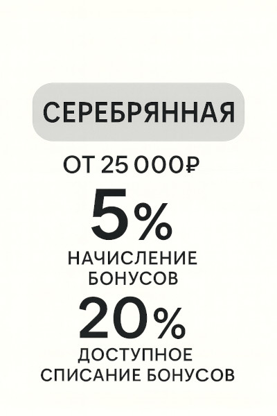 - Серебрянный - карта с кешбеком бонусными баллами на 5% от всей суммы чека. Выдается при сумме всех покупок за 6 месяцев от 25000р. Бонусными баллами можно оплатить до 25% от суммы покупки.