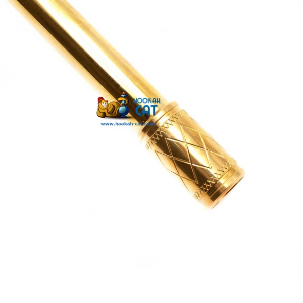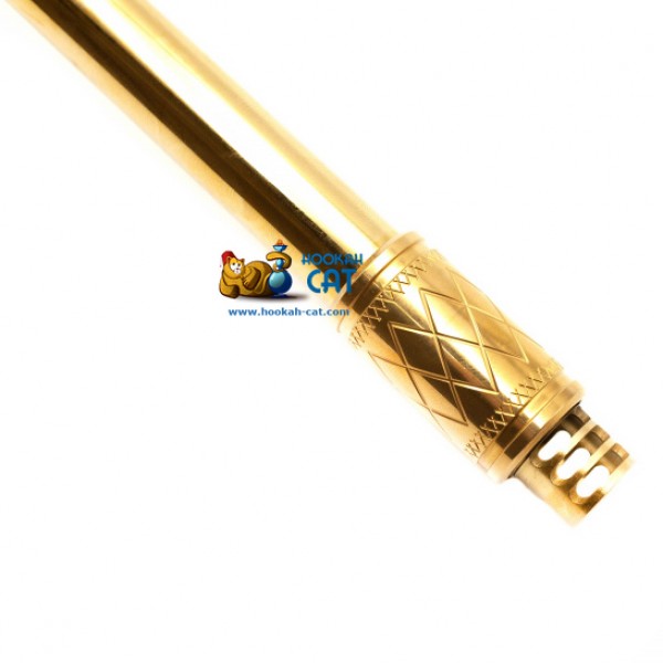 Помимо его особенных отличий, так же стоит отметить, что кальян довольно высокий (высота с колбой примерно 60см), а погружная шахта имеет так же золотой окрас. Накладка, как и основание покрыты анодированным алюминием черного цвета. Мундштук стилизован под шахту и довольно удобно лежит в руке. На блюдце, кстати, имеется дополнительная сеточка, которая способствует не такому быстрому потуханию угля, если скинуть на нее лишний кубик.