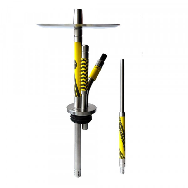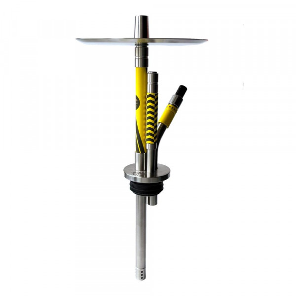 Стиль кальяна - скорость, гонки, желтый цвет - как спорткар, а на блюдце сделана гравировка в виде спидометра. Смотрится реально круто! При этом кальян сделан полностью из нержавеющей стали, и полностью разборный!