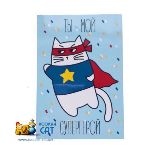 Открытка КОТКА - Ты Мой Супер Герой - если вы решили купить у нас подарок вашим близким, то можно не тратить время на поиски открытки, а сразу взять ее у нас! Теперь у Кальянного Кота есть такие красивые и смешные открытки созданные прекрасной художницей Ариной Родина! На самом деле, чтобы их дарить повод даже не нужен ;)